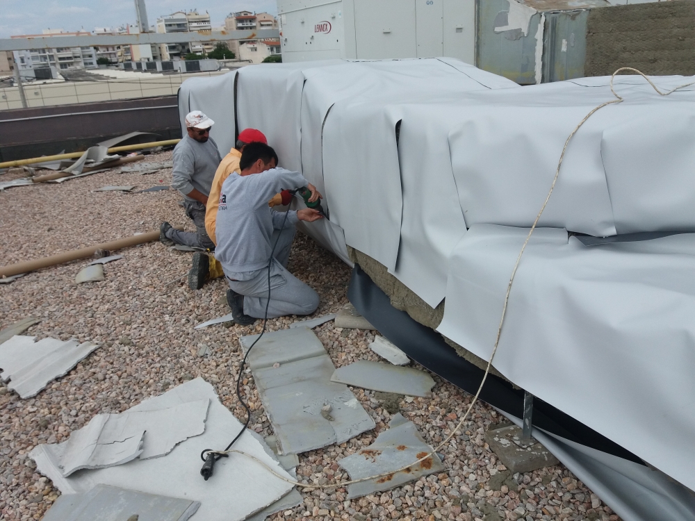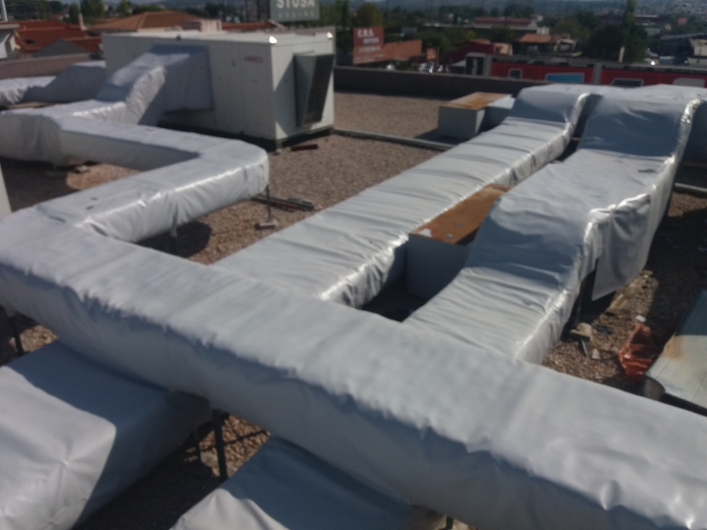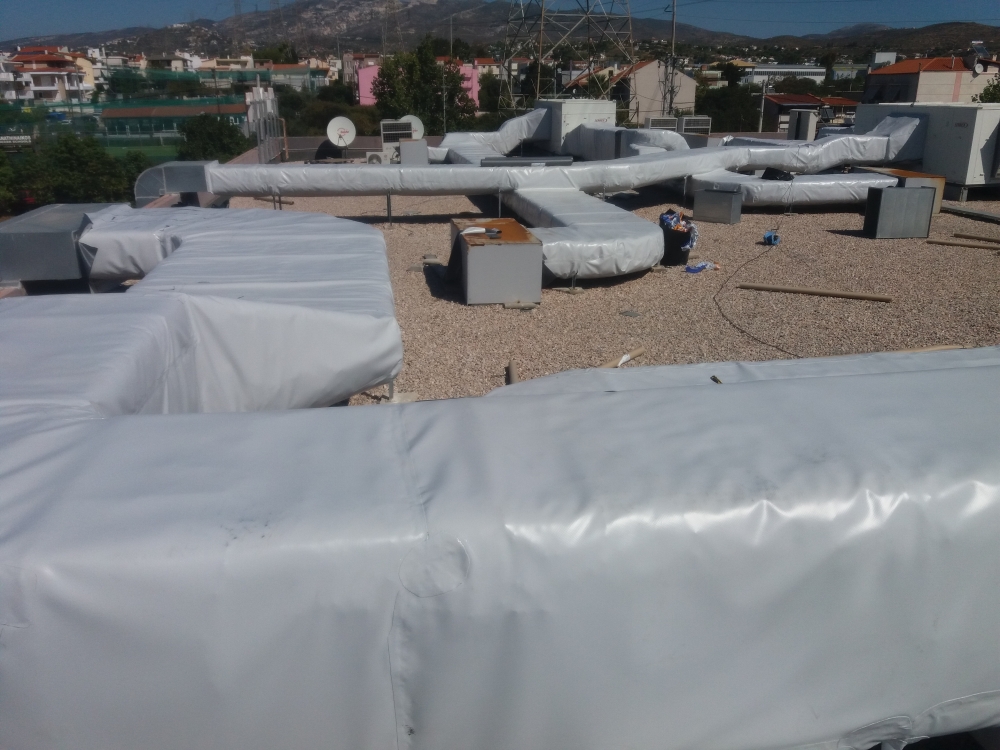 Μόνωση αεραγωγών καταστήματος Media Markt στον Γέρακα Αττικής με την τοποθέτηση πετροβάμβακα Fibran Geo 65 και στεγανωτικής μεμβράνης Sikaplan 15G, συνολικής επιφάνειας 850 m2