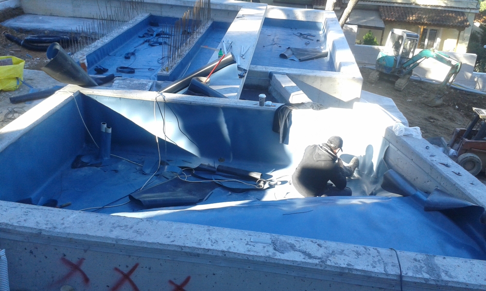 Εργασίες μονώσεων υπογείων και περιβάλλοντος χώρου οικίας στην Πολιτεία με τσιμεντοειδές κονίαμα SikaTopseal 107SH για επιφάνειες 250m2, και μεμβράνη PVC, Sikaplan WP 2100-20HL συνολικών επιφανειών 800 m2