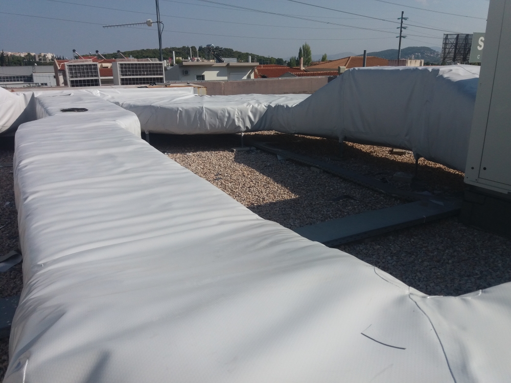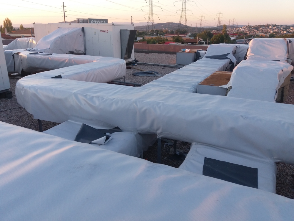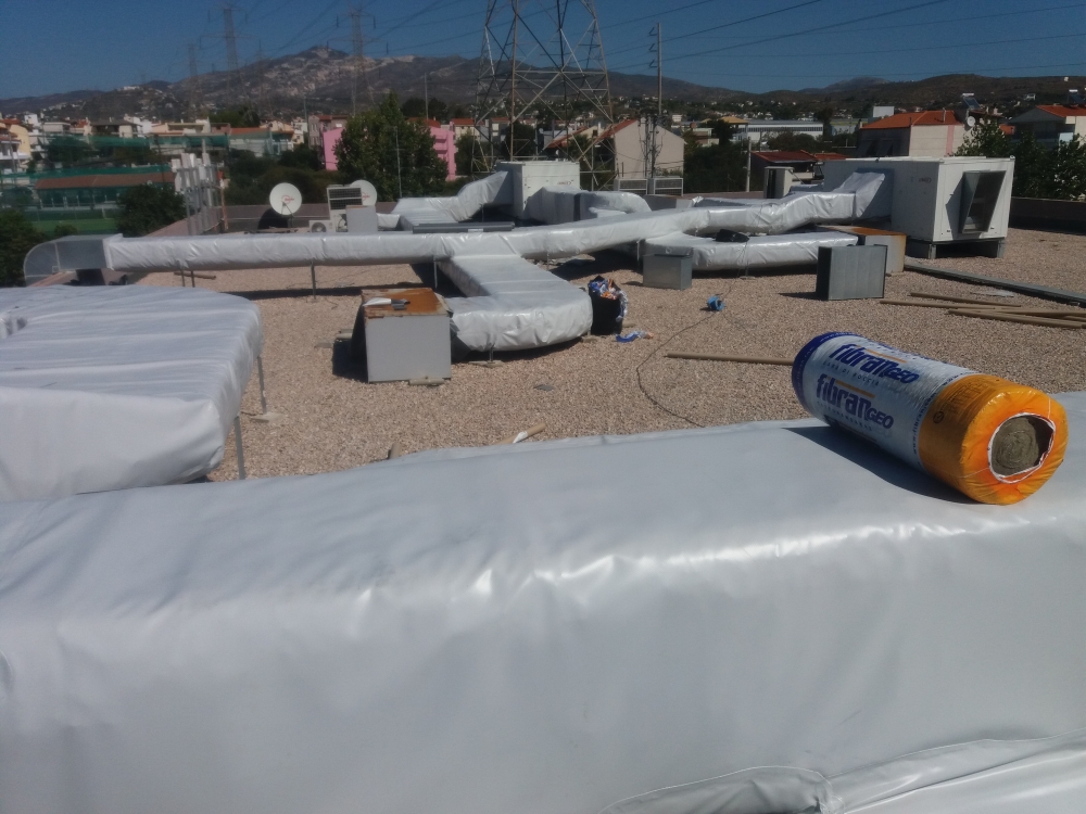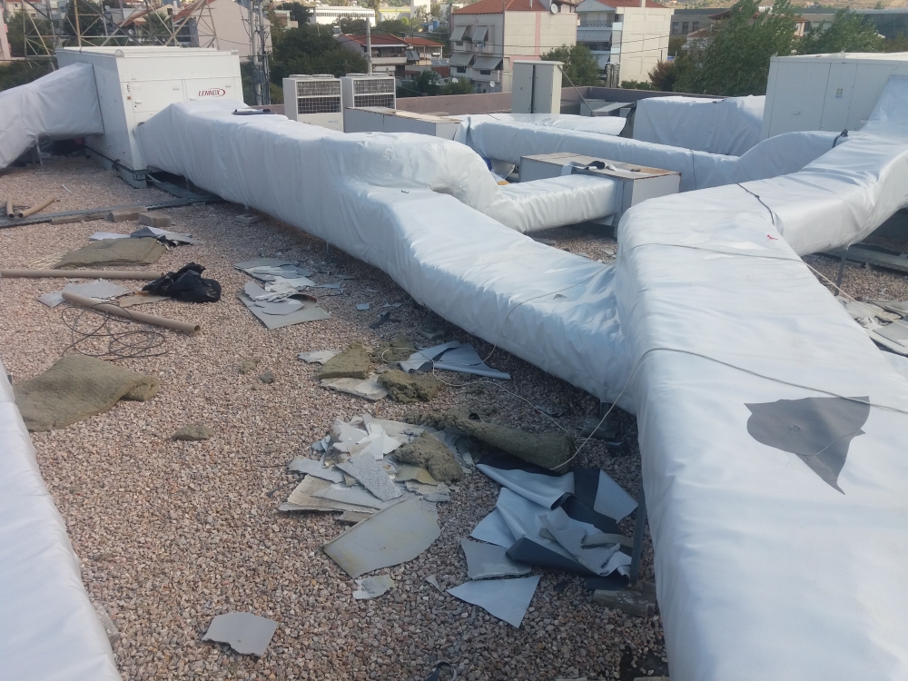 Μόνωση αεραγωγών καταστήματος Media Markt στον Γέρακα Αττικής με την τοποθέτηση πετροβάμβακα Fibran Geo 65 και στεγανωτικής μεμβράνης Sikaplan 15G, συνολικής επιφάνειας 850 m2